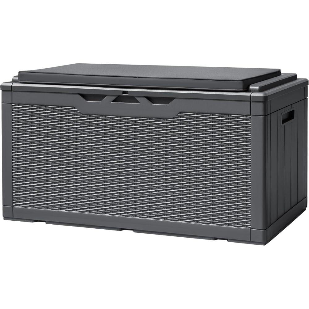 High-quality Resin: The deck storage box is made of water-resistant resin, complemented by a wood like grain design that maintains a fresh look even with all-weather use