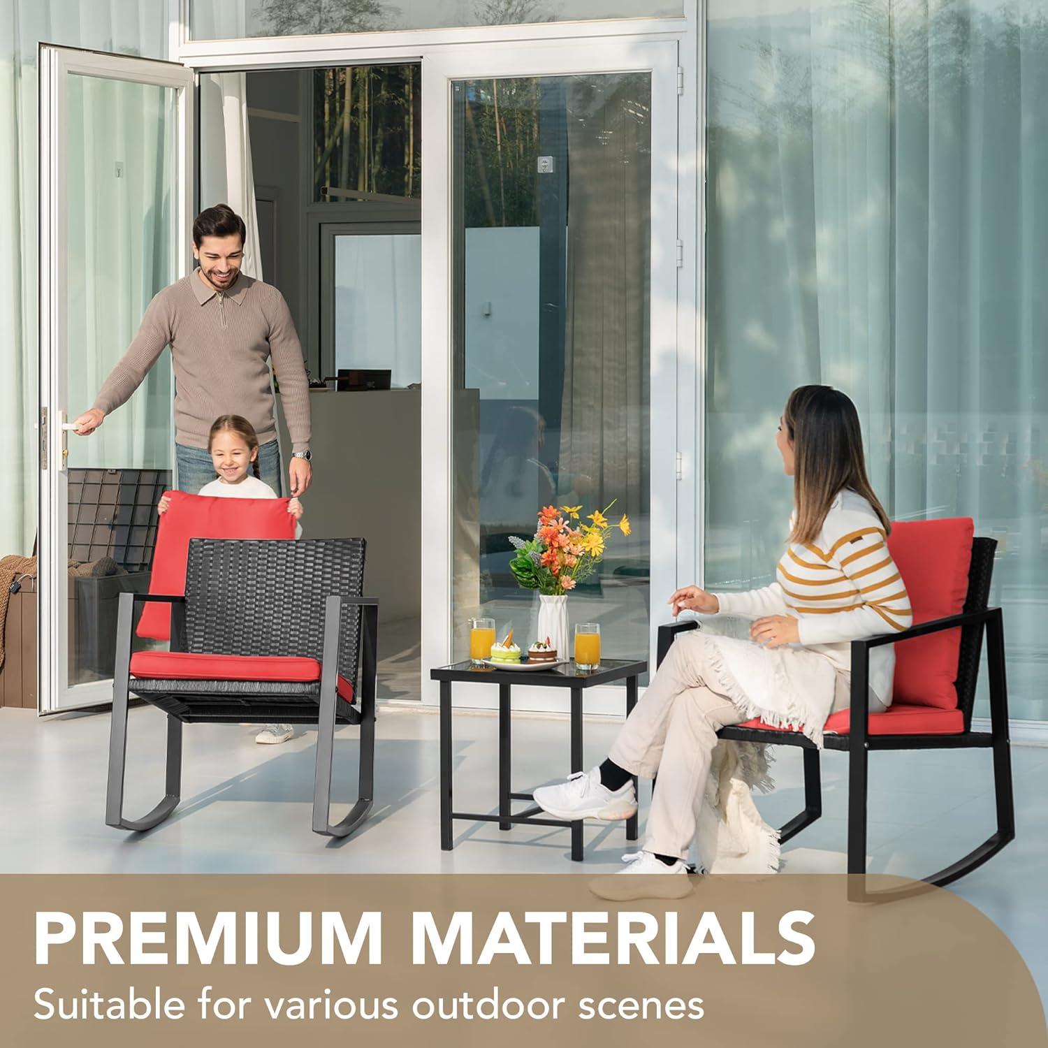 Devoko 3 pieces patio bistro sets including 2 rocking chairs and 1 tempered glass coffee table. All weather resistant and UV resistant rattan with modern design patio sets complement any space and the durable construction, which is best for outdoor entertainment in summer or autumn.