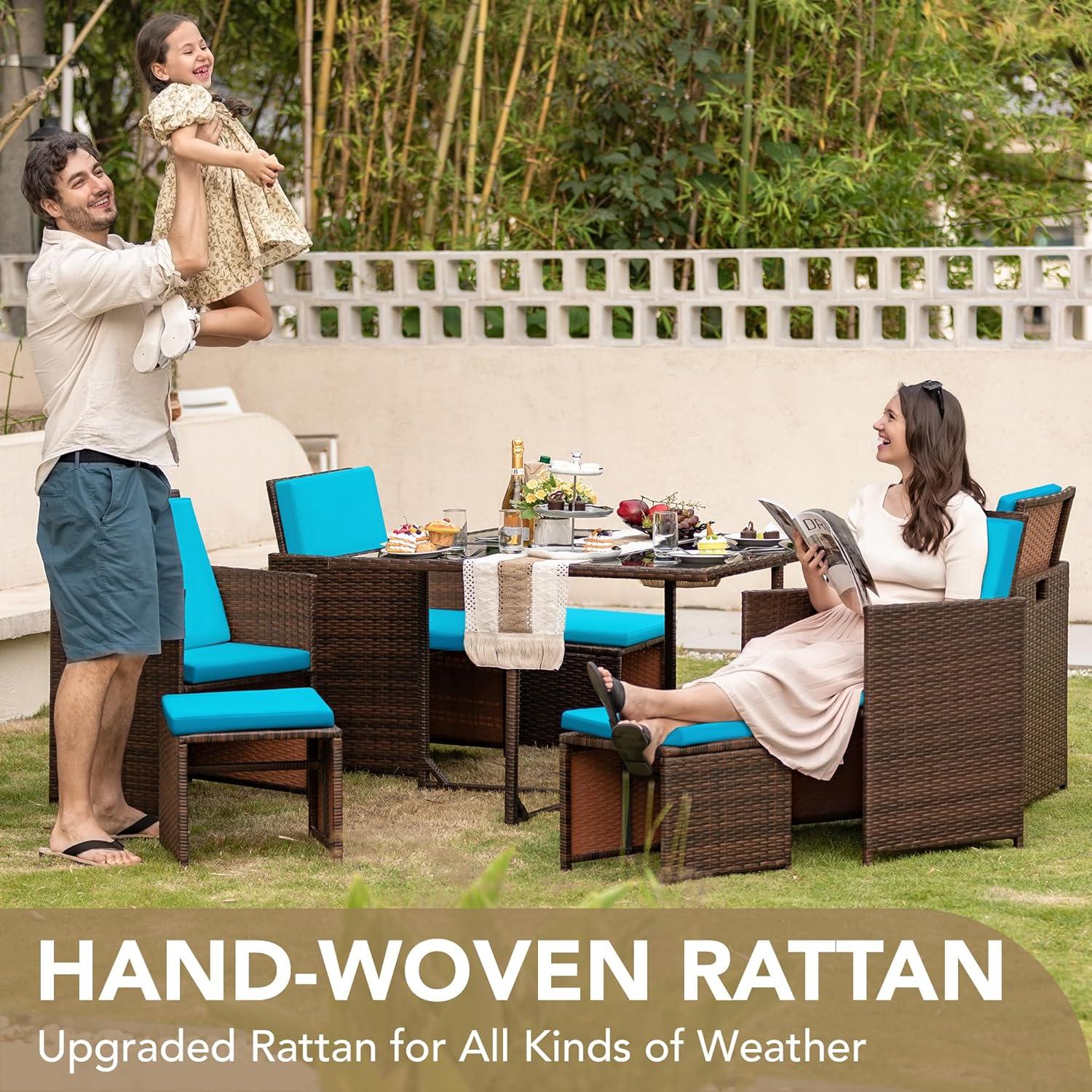 Devoko 9 Pieces Patio Dining Sets Outdoor Space Saving Rattan Chairs with Glass Table Patio Furniture Sets Cushioned Seating and Back Sectional Conversation Set (Beige)(Brown/Blue)