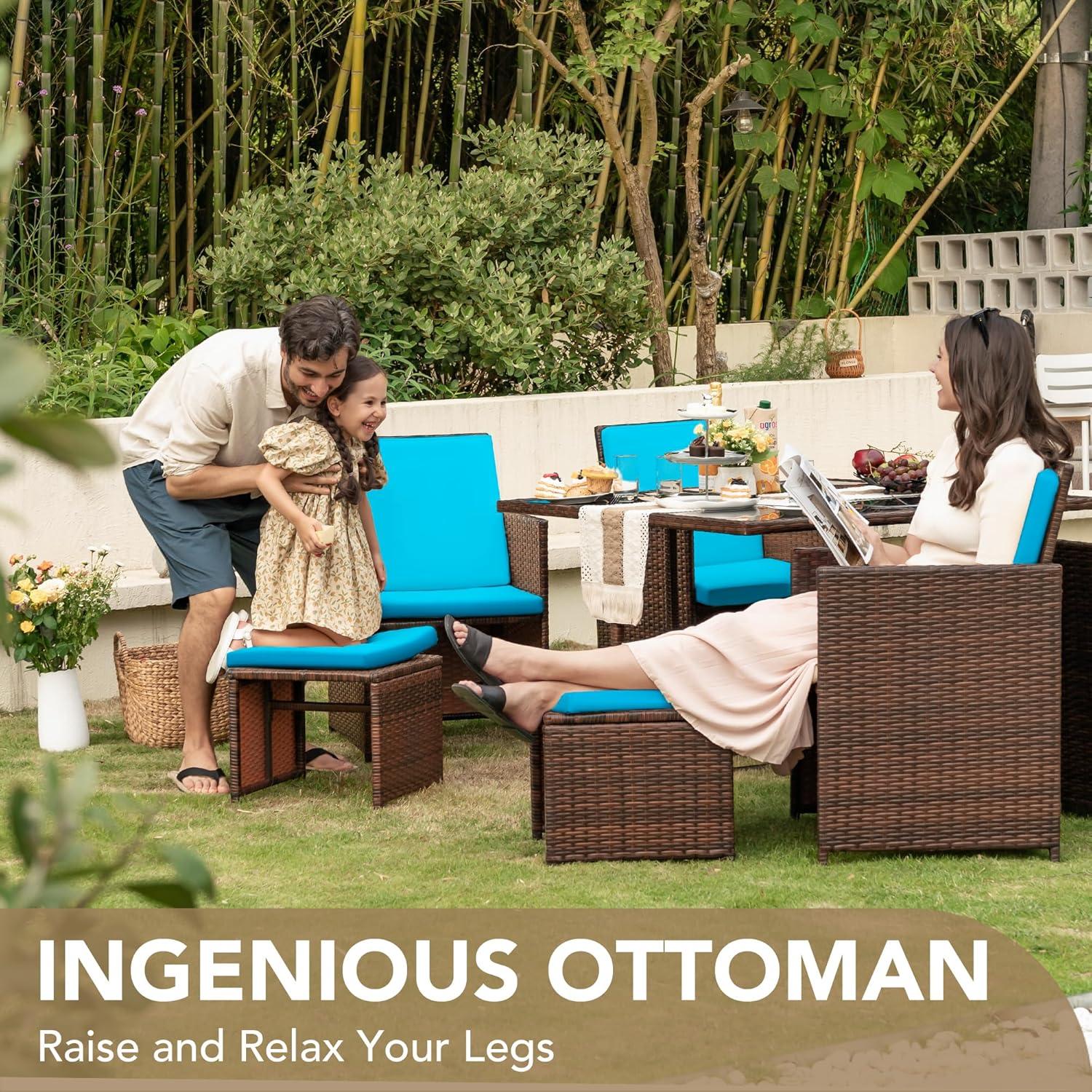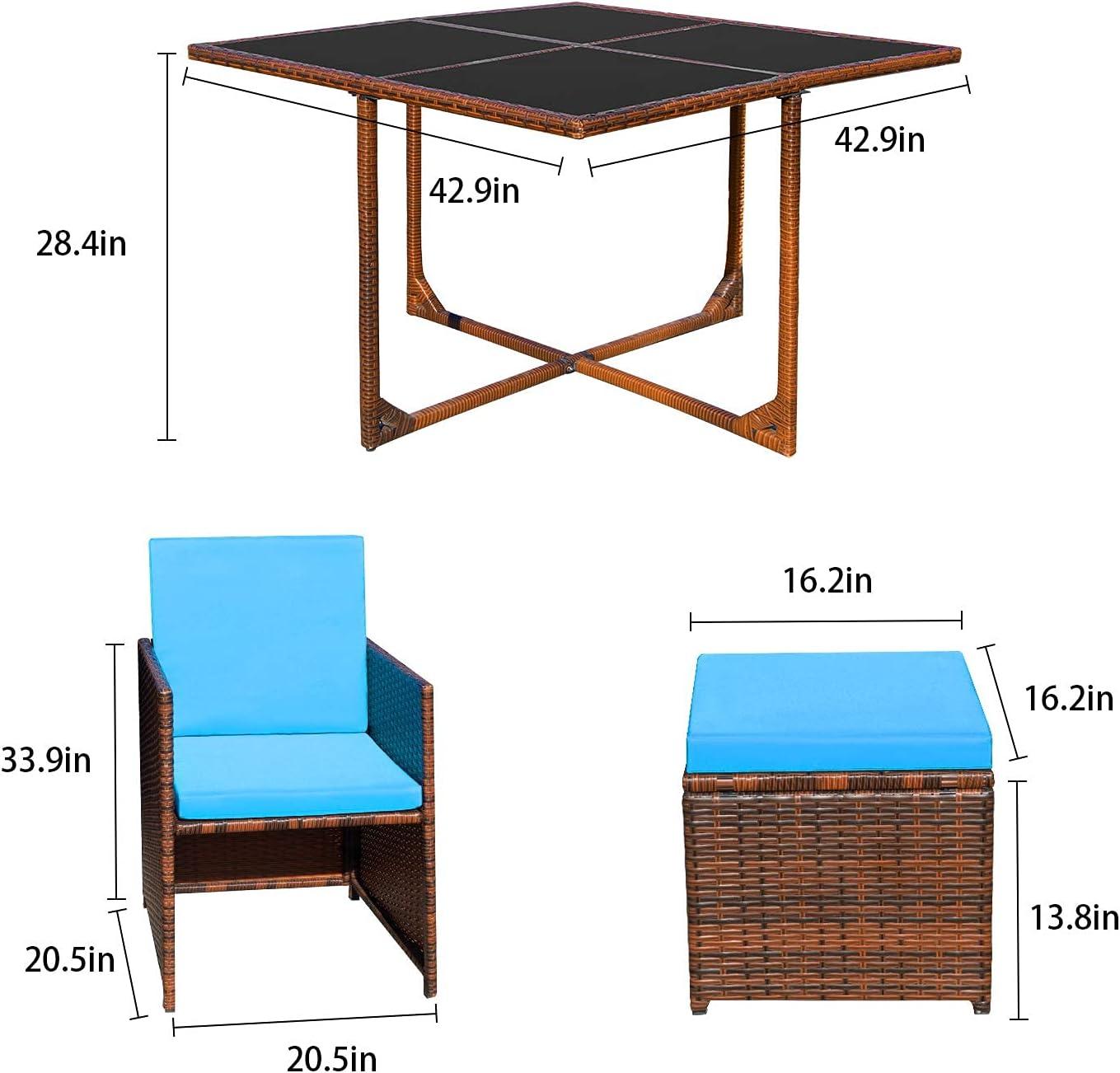 [Comfortable Patio Dining Set] Devoko 9 pieces patio dining sets including 1 table, 4 single chairs, 4 ottomans and 12 cushions. These zippered cushions fill with thick giving you optimal comfort and relaxation