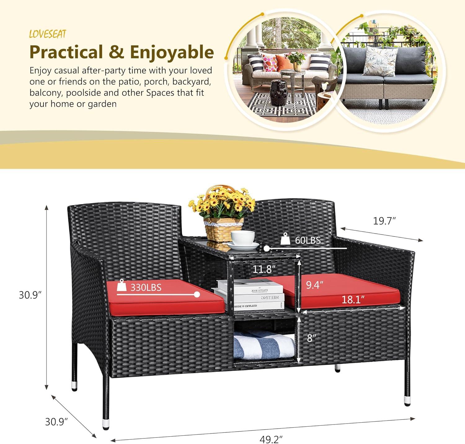 Practical & Enjoyable: Whether you are taking a break or having a vacation, this loveseat is designed for you and your friends enjoying the leisure time freely. With the built-in table and storage space, a cup of coffee, a bottle of wine, a plate of fruit or some of your favorite books can be placed within your reach, adding more convenience to your chatting or reading time.