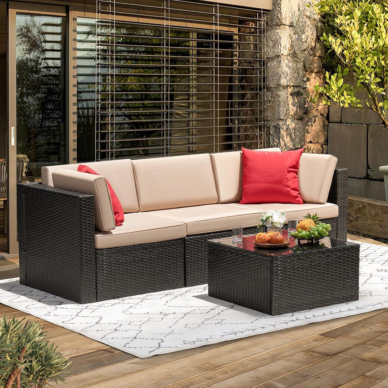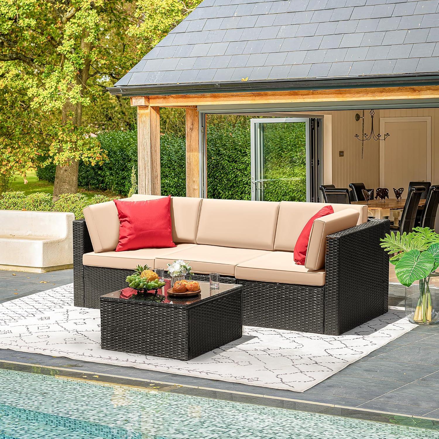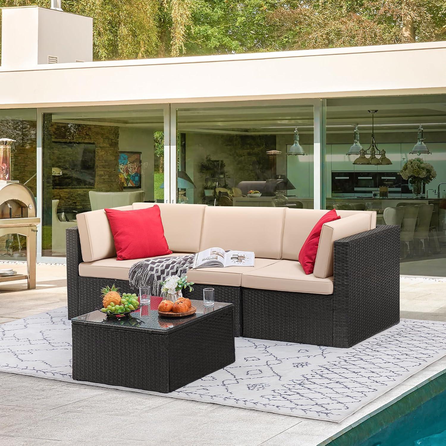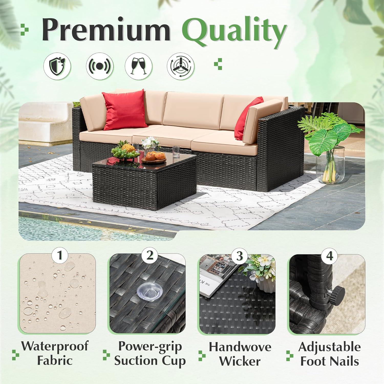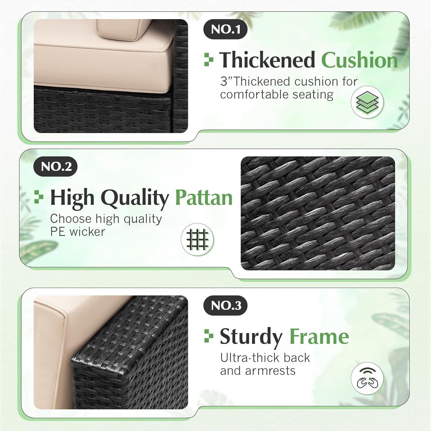 – Sturdy & Durable: This outdoor sectional sofa sets with solid frame, high quality PE wicker are strong enough to withstand all weather variations. Thickened cushions and water-resistant durable tempered glass are easy to clean