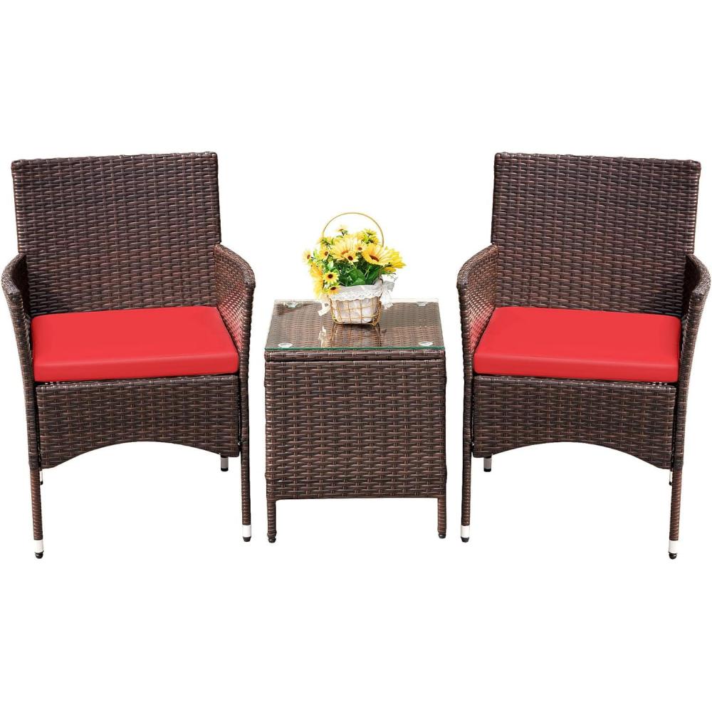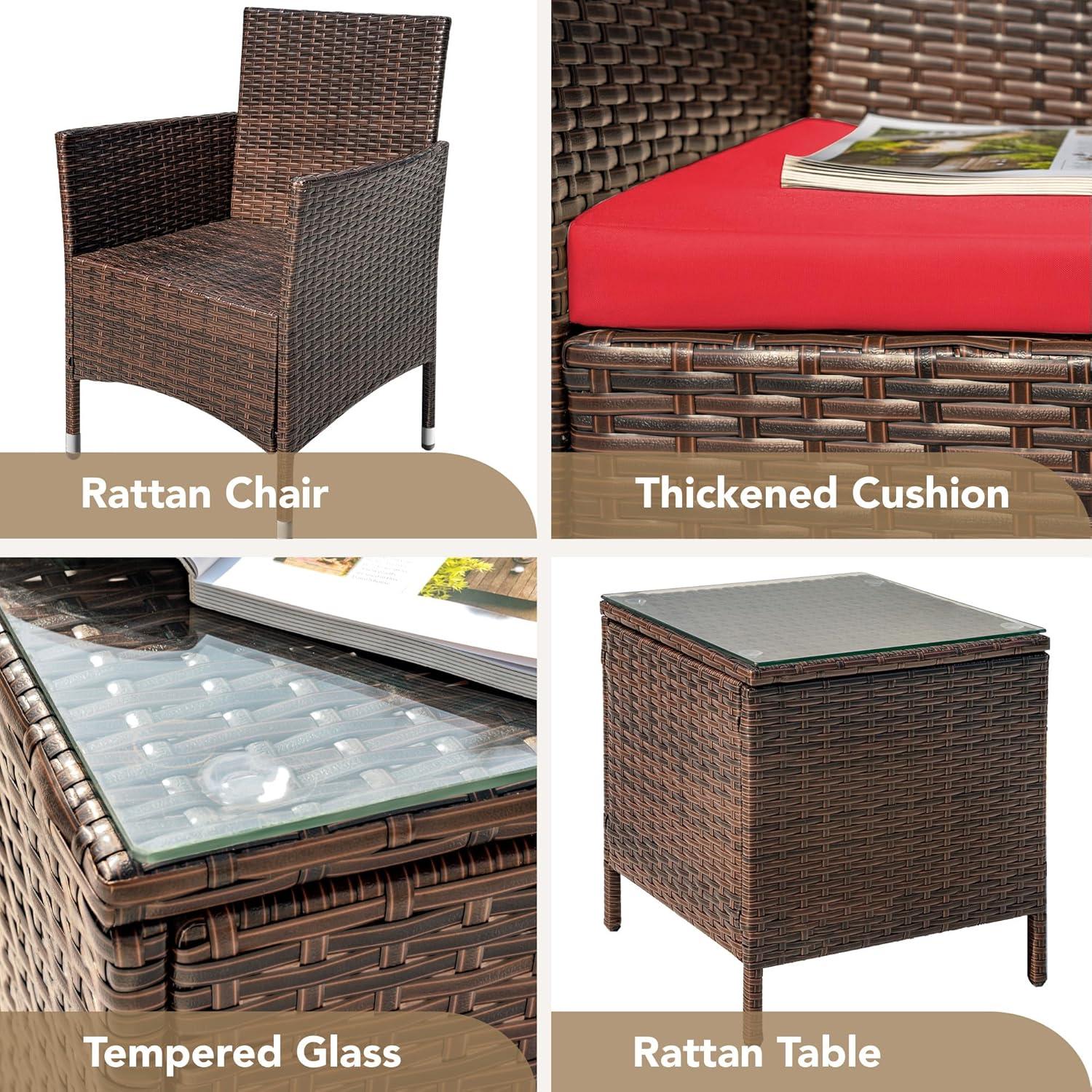 Devoko Patio Porch Furniture Sets 3 Pieces PE Rattan Wicker Chairs with Table Outdoor Garden Furniture Sets (Brown/Blue)(Brown/Red)