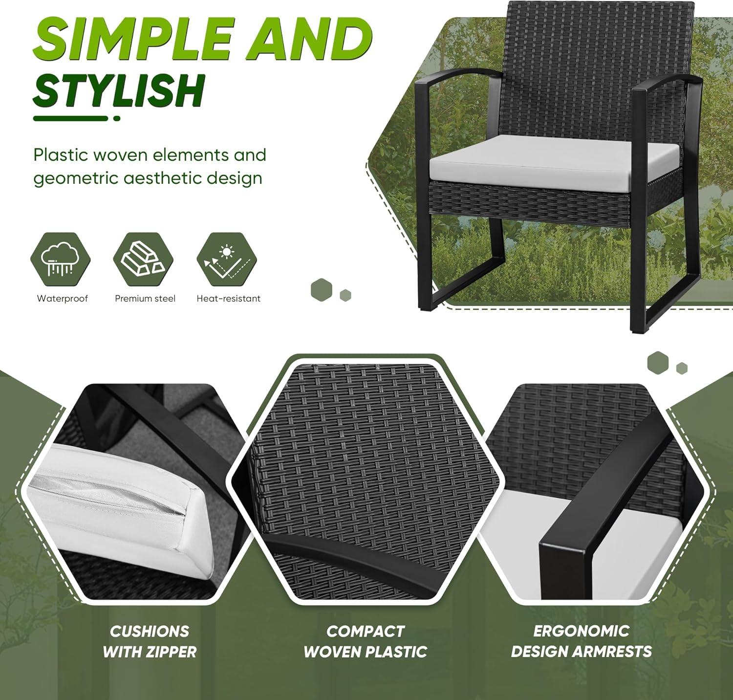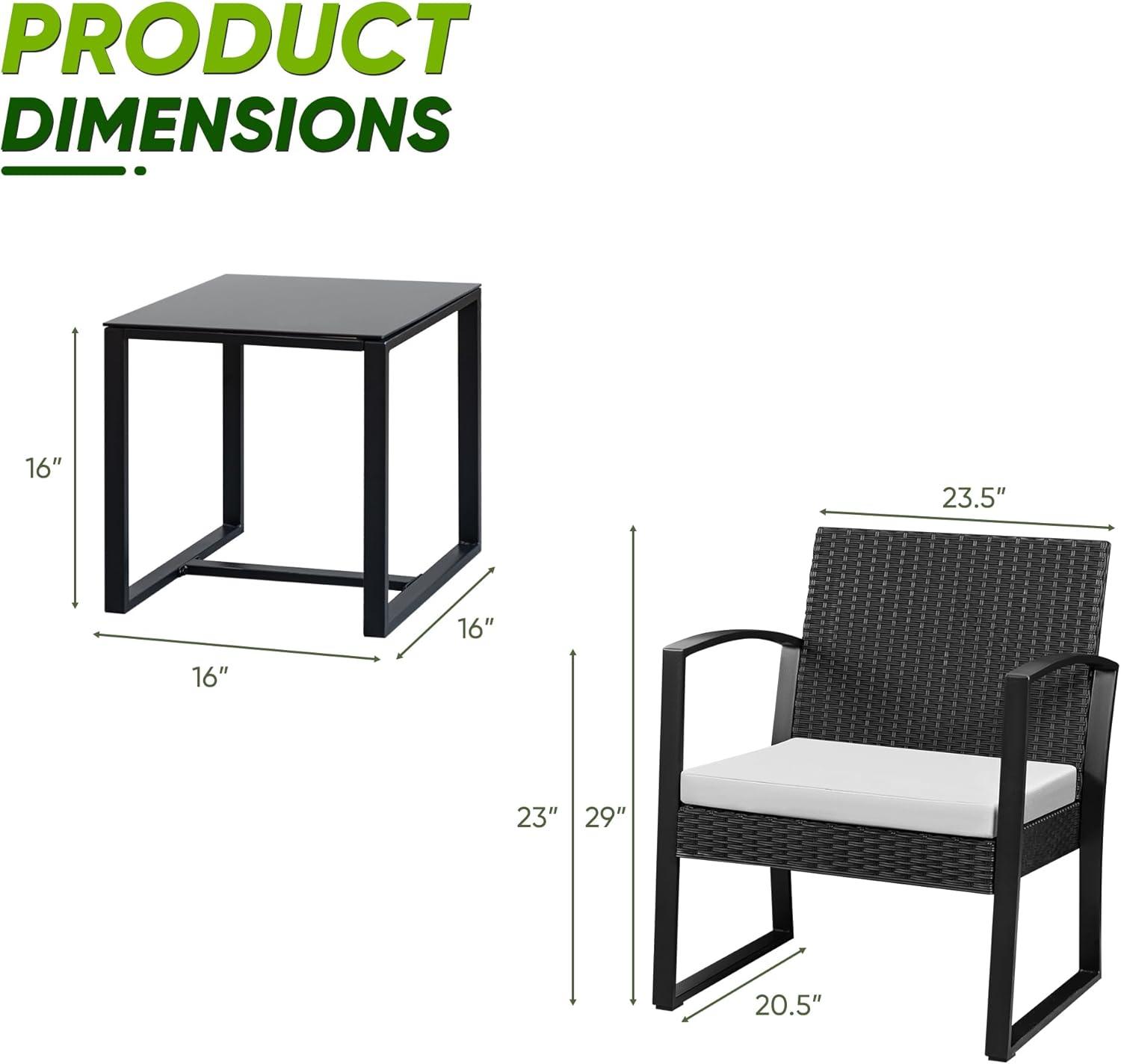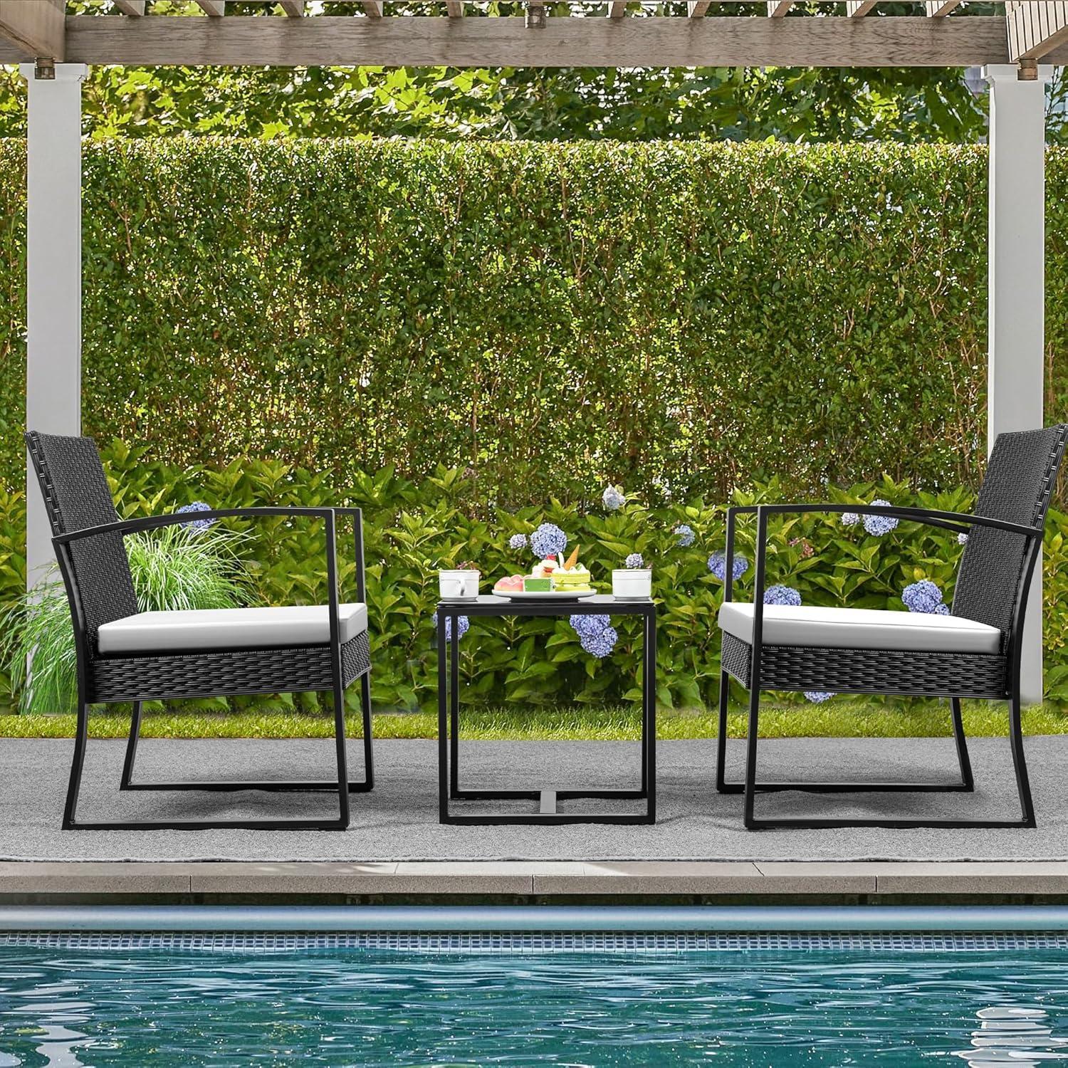 Devoko Resin Patio Furniture Set 3 Piece All Weather Outdoor Bistro Chairs with Cushions and Coffee Table for Outside Garden Balcony Porch (Black)(White)