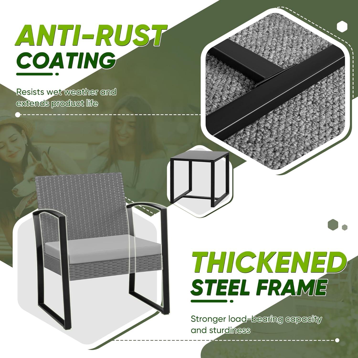 Devoko Resin Patio Furniture Set 3 Piece All Weather Outdoor Bistro Chairs with Cushions and Coffee Table for Outside Garden Balcony Porch (Black)(Grey)